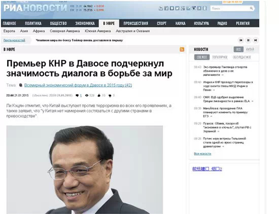 俄新社21日以《中國總理強調以對話促進和平的重要性》為題報道了李克強總理在達沃斯論壇上的致辭。報道中援引了李克強“世界各國都要像愛護自己的眼睛一樣愛護和平”的說法,并指出,中國反對一切形式的恐怖主義。文章寫道,今年是世界反法西斯戰爭勝利70周年,李克強強調了維護戰后國際秩序的重要性。