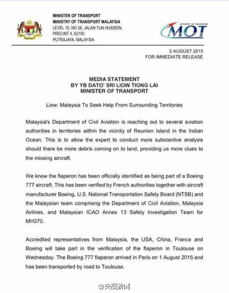 聲明說,他們了解到,經過法國當局以及波音公司、美國國家交通安全委員會和馬來西亞派出的工作組的鑒定,此前發現的襟副翼已經被正式認定來自一架波音777客機。來自馬來西亞、美國、中國、法國和波音公司的代表還將在5日于法國圖盧茲參加對這塊襟副翼的鑒定工作。