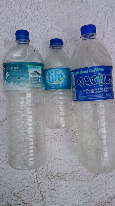 圖為當地律師發現的三個礦泉水瓶,其中一個標有中文字樣