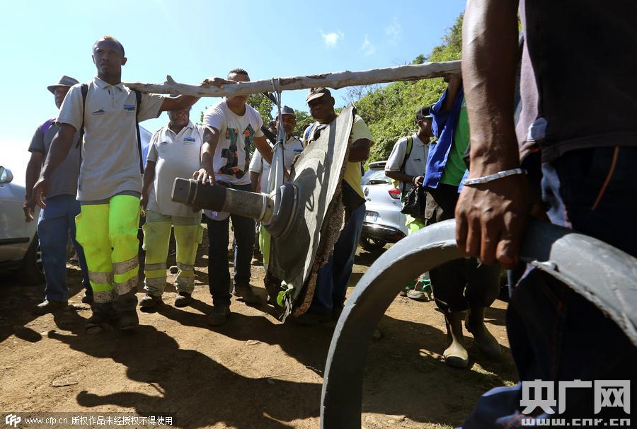 當地時間2015年8月11日,法屬留尼汪島,當地搜救隊獲得的馬航MH370殘骸。