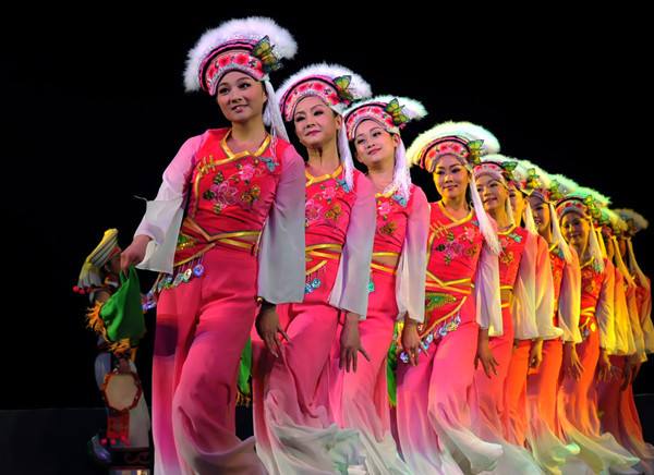 2014年1月,云南“滇韻彩云南”演出團春節赴新加坡演出。圖為演員在排演景頗族歌舞《目瑙縱歌》。