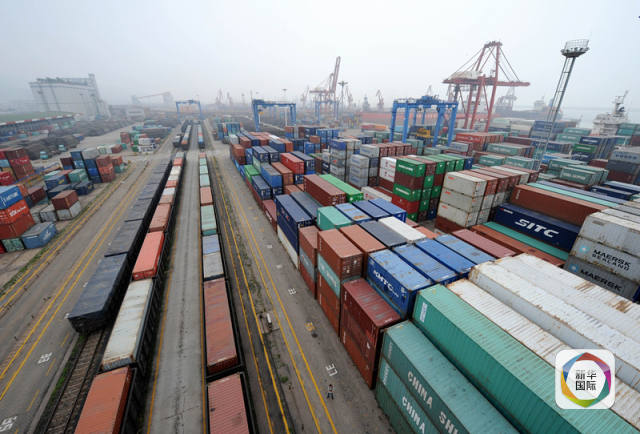 這張2014年6月27日拍攝的照片顯示,在連云港港區內的新亞歐大陸橋鐵路運輸專線站場,準備運往哈薩克斯坦的過境集裝箱在裝車。(新華社記者孫參攝)