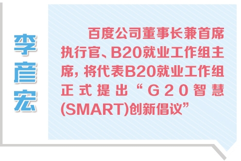就業(yè)是B20的重點議題之一,也是當今世界面臨的重要問題之一。如何創(chuàng)造更加充分、更高質(zhì)量的就業(yè)機會,推動實現(xiàn)經(jīng)濟的持續(xù)和平衡增長,是各國面臨的重要任務。根據(jù)G20杭州峰會的“創(chuàng)新增長方式”議題,B20就業(yè)工作組主席、百度公司董事長兼首席執(zhí)行官李彥宏代表B20就業(yè)工作組提出了“G20智慧(SMART)創(chuàng)新倡議”。這一倡議得到了二十國集團工商界、商協(xié)會、國際機構(gòu)和智庫代表的廣泛認可。