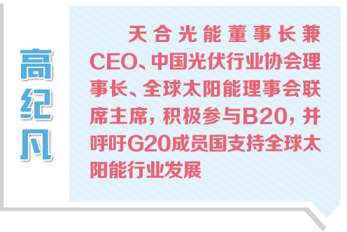 出席B20的全球太陽能理事會聯(lián)席主席、天合光能董事長兼CEO高紀凡在接受《經(jīng)濟日報》記者采訪時表示,太陽能發(fā)電已成為全球最便宜的電力資源之一,建議二十國集團(G20)支持全球太陽能理事會“至2030年在太陽能行業(yè)創(chuàng)造1000萬個就業(yè)機會”的目標,建立太陽能領域的國家級、公私合作的數(shù)據(jù)收集和傳播網(wǎng)絡。