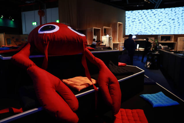 ↑這是7月6日在德國漢堡拍攝的G20領導人峰會國際新聞中心餐飲區擺放的螃蟹造型玩偶。新華社記者羅歡歡攝