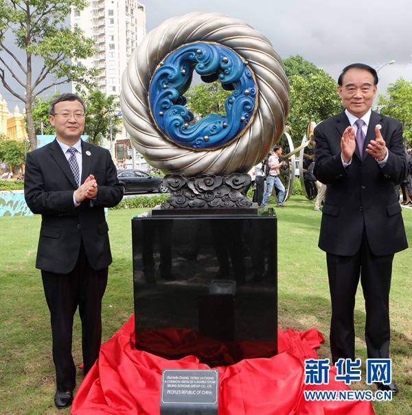 11月9日,在越南峴港APEC公園,中國外交部副部長(zhǎng)李保東(右)、商務(wù)部副部長(zhǎng)王受文(左)共同為中國贈(zèng)送的雕塑作品《和夢(mèng)同圓》揭幕。作為2017年亞太經(jīng)合組織(APEC)領(lǐng)導(dǎo)人會(huì)議周的一部分,越南峴港APEC公園9日正式開放,展示21個(gè)成員經(jīng)濟(jì)體藝術(shù)家創(chuàng)作的雕塑。新華社記者李鵬攝