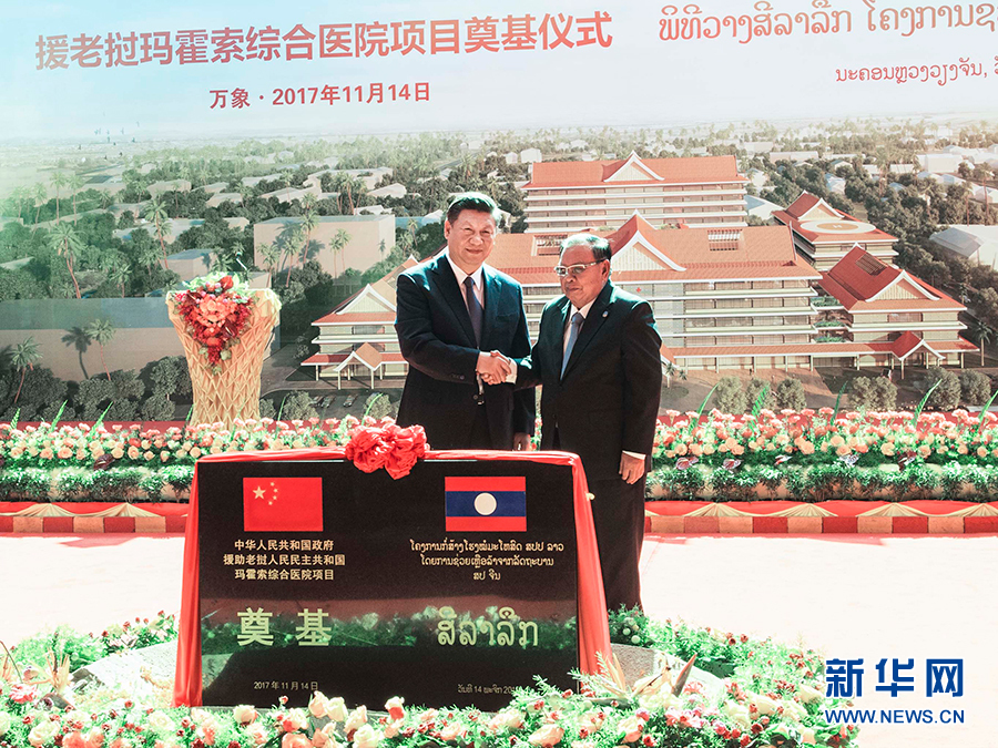 11月14日,中共中央總書記、國家主席習近平同老撾人民革命黨中央委員會總書記、國家主席本揚在萬象一道出席瑪霍索綜合醫院奠基儀式。新華社記者 李濤 攝