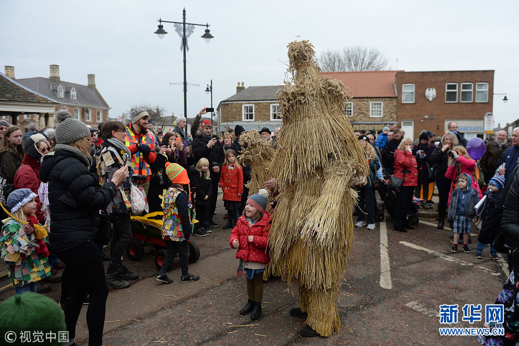 英國小鎮慶?!暗静菪堋惫?民眾跟隨草人盡情舞動