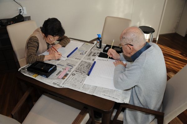 資料圖片:2017年2月27日,在位于日本東京品川區的養老院“日醫HOME南品川”,兩名老人在練習描字。新華社記者華義攝
