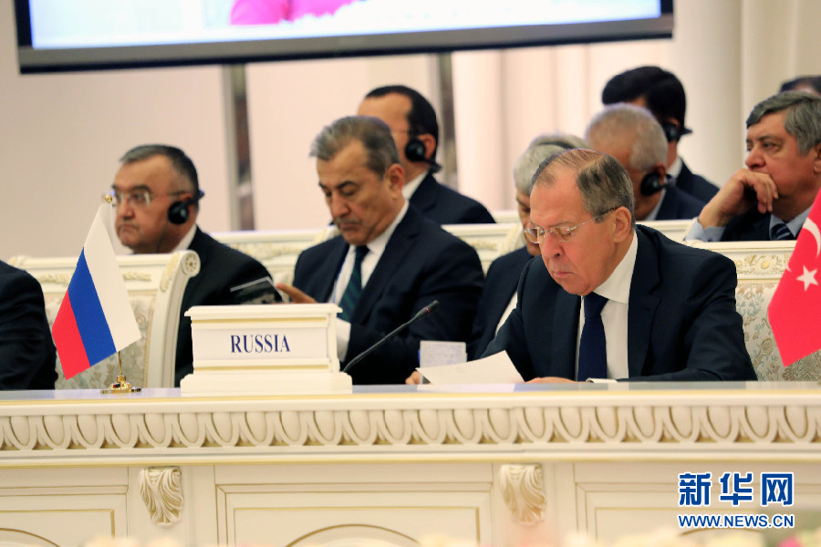 俄羅斯外長(zhǎng)拉夫羅夫(前排右一)出席會(huì)議。阿富汗問(wèn)題高級(jí)別會(huì)議27日在烏茲別克斯坦首都塔什干舉行。新華社記者周良攝