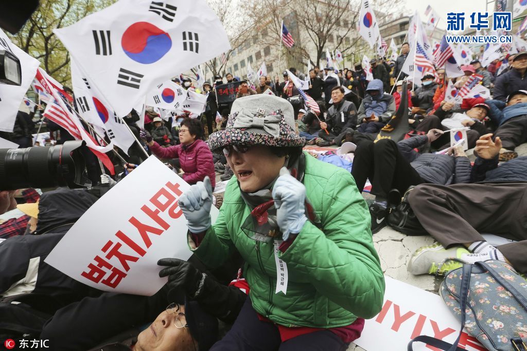 當(dāng)?shù)貢r(shí)間2018年4月6日,韓國(guó)首爾,在首爾中央地方法院前,韓國(guó)前總統(tǒng)樸槿惠的支持者在得知樸槿惠一審獲刑24年后,舉行集會(huì)游行。據(jù)報(bào)道,首爾中央地方法院對(duì)韓國(guó)前總統(tǒng)樸槿惠作出一審宣判,判處其有期徒刑24年,罰款180億韓元(約合人民幣1.06億元)。(圖片來(lái)源:東方IC)