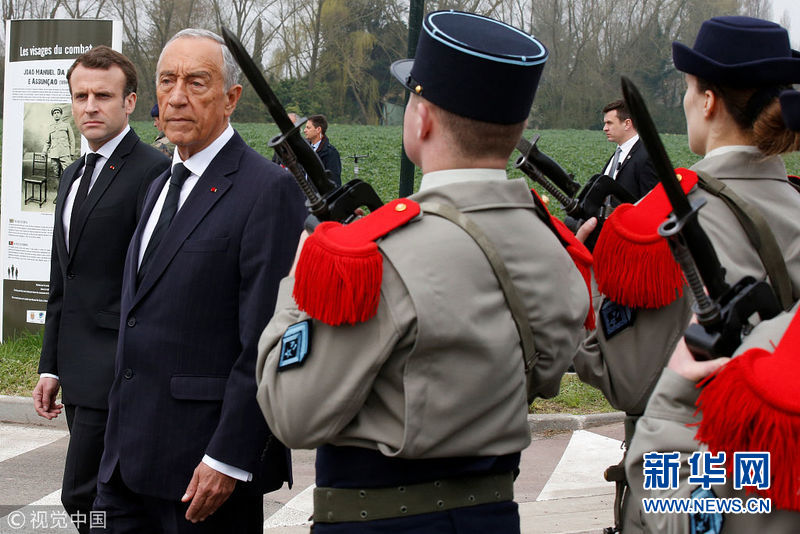 4月9日,法國里什堡,法國總統馬克龍和葡萄牙總統馬塞洛·雷貝洛·德索薩在一戰葡萄牙公墓出席一戰紀念儀式,紀念利斯戰役百年。(圖片來源:視覺中國)