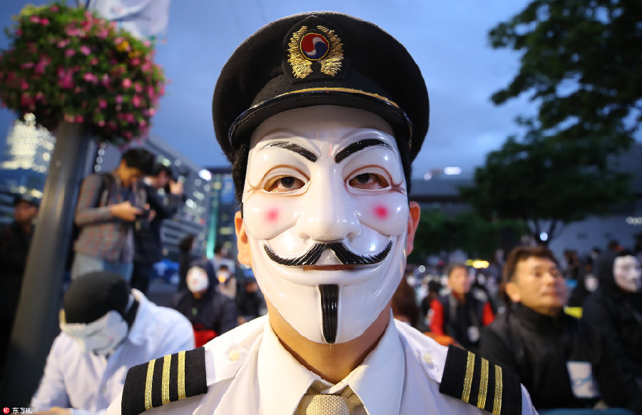 當地時間2018年5月18日,韓國首爾,大韓航空有限公司的飛行員戴著蓋伊·福克斯面具,在首爾市區集會抗議,反對大韓航空會長兼首席執行官趙亮鎬及其家庭。