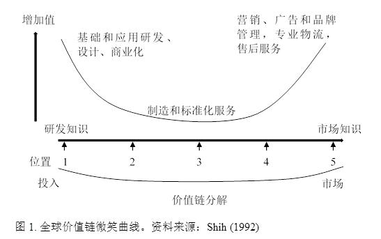 全球價值鏈構建了一個跨國或者跨地區不同公司實現不同的工序和商業功能的生產架構(Grossman和Rossi-Hansberg,2012)。這個架構是“生產性的(價值增長的)通向并且支持最終使用的順序” (Sturgeon 2001)。微笑曲線提出了一種不同的解構國際貿易的方法。有些國家專業化“生產”知識與研發,而另一些國家專業化于制造業,或者品牌營銷。因此,一個產品的增加值不再是完全屬于某一個國家,而是整條價值鏈上的參與者都可以分一杯羹。在為最終產品貢獻價值的生產工序的鏈條上(既,產品的價值鏈),一般的工序鏈條開始于基礎和應用研究與設計。這些研究與設計活動往往會帶來新的想法、技術、新產品設計和新的生產工藝。這個工序鏈條下一環節是商業化這些研究成果,如專利和知識產權(想法、論文、知識等);再下一環節是資源的獲取和材料的生產(包括農業產品),零部件的生產和產品的組裝,以及最后環節的營銷、廣告、品牌管理、物流、商業服務和售后服務。另外,價值鏈在文獻中的定義是超出中間品貿易的,它強調在不同環節上領先企業與供應商之間的權力架構 (Milberg,2004)。