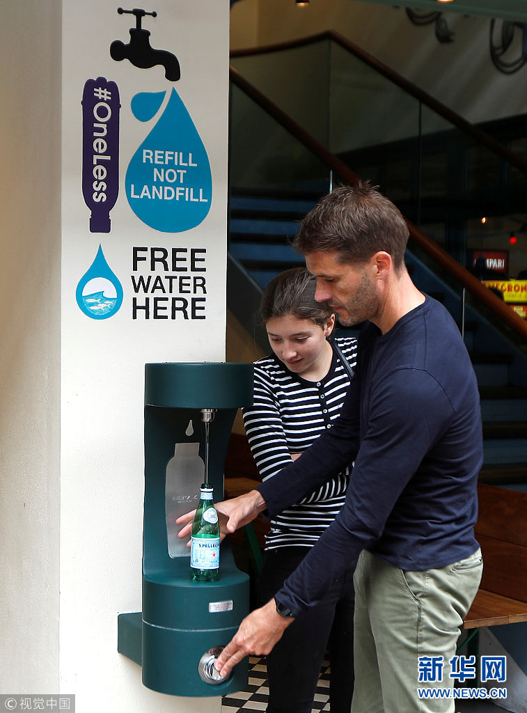 當地時間2018年8月28日,英國倫敦,民眾在公共飲水機旁飲水。倫敦市長近日引進了20個新的公共飲水機,鼓勵人們自帶杯子取水喝,從而減少塑料垃圾。 (圖片來源:視覺中國)