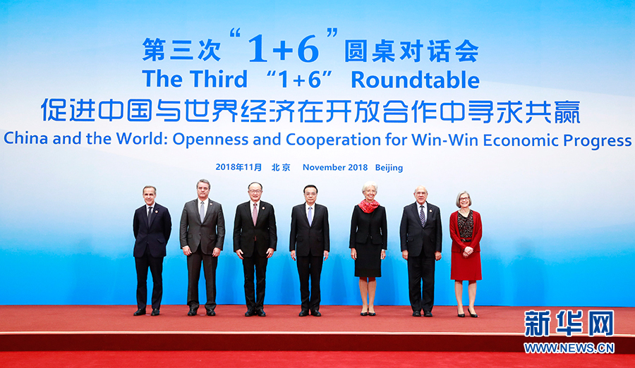 新華社北京11月6日電(記者鄭明達)國務院總理李克強6日下午在釣魚臺國賓館同世界銀行行長金墉、國際貨幣基金組織總裁拉加德、世界貿(mào)易組織總干事阿澤維多、經(jīng)濟合作與發(fā)展組織秘書長古里亞、金融穩(wěn)定理事會主席卡尼和國際勞工組織副總干事格林菲爾德舉行第三次“1+6”圓桌對話會。會議圍繞“促進中國與世界經(jīng)濟在開放合作中尋求共贏”的主題,就中國經(jīng)濟和改革開放等議題深入交流。