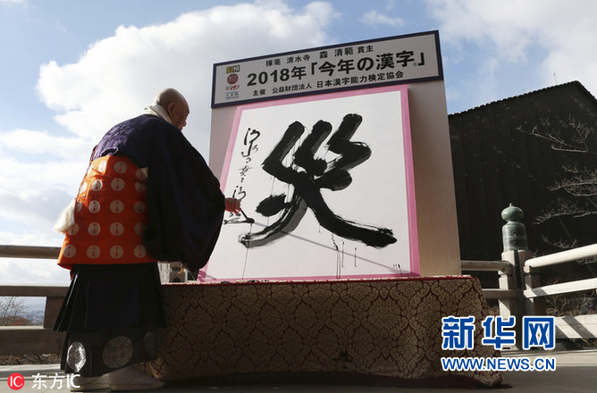 當?shù)貢r間2018年12月12日,日本京都,京都清水寺住持森清范在巨幅和紙上揮毫寫下了今年的年度漢字——“災”。(圖片來源:東方IC)