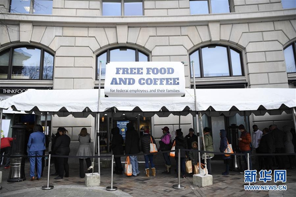 1月23日,在美國首都華盛頓,一些聯邦政府雇員在一家公益組織的“應急食堂”外排隊領取免費餐。 新華社記者 劉杰 攝