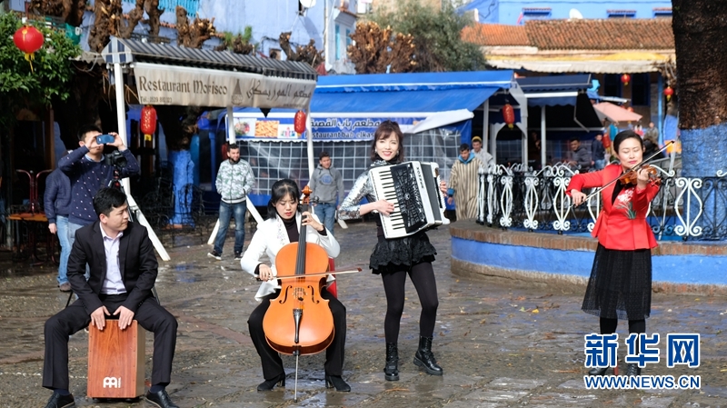 2月1日,在摩洛哥“藍色小鎮(zhèn)”舍夫沙萬,重慶市歌劇院的演員們進行快閃表演。新華社記者陳斌杰 攝
