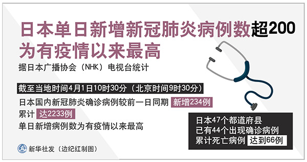 新華社東京4月1日電(記者華義)據日本廣播協會(NHK)電視臺統計,截至當地時間4月1日10時30分(北京時間9時30分),日本國內新冠肺炎確診病例較前一日同期新增234例,累計達2233例;單日新增病例數為有疫情以來最高。