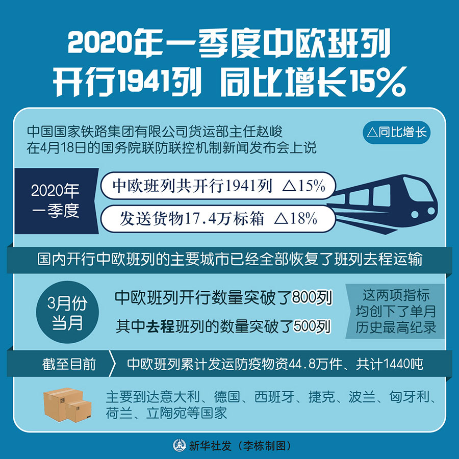 新華社北京4月18日電(記者王希、于文靜)中國國家鐵路集團(tuán)有限公司貨運(yùn)部主任趙峻在18日的國務(wù)院聯(lián)防聯(lián)控機(jī)制新聞發(fā)布會上說,今年一季度,中歐班列共開行1941列,發(fā)送貨物17.4萬標(biāo)箱,同比分別增長15%和18%。