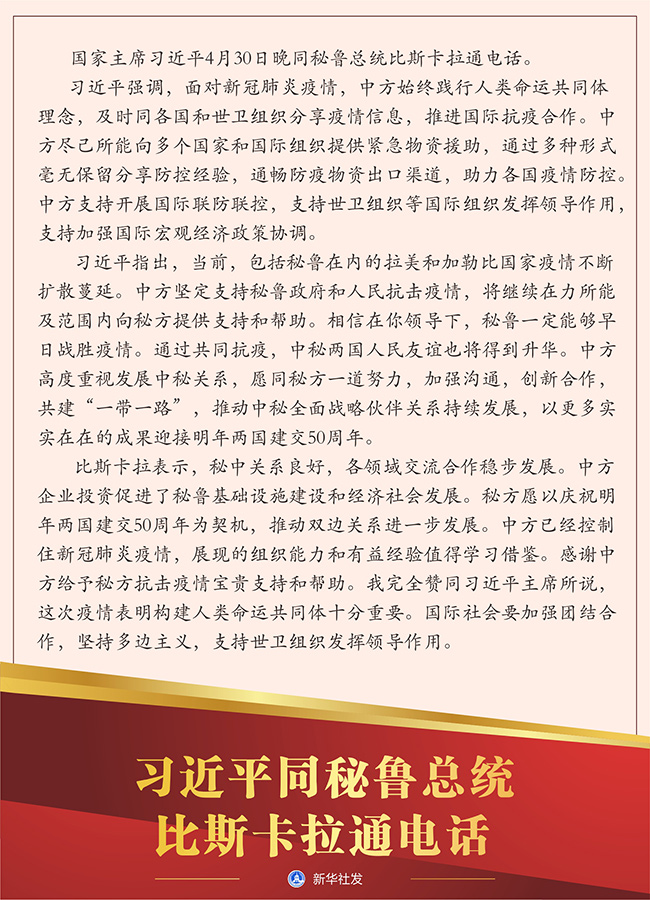 習近平指出,當前,包括秘魯在內的拉美和加勒比國家疫情不斷擴散蔓延。中方堅定支持秘魯政府和人民抗擊疫情,將繼續在力所能及范圍內向秘方提供支持和幫助。相信在你領導下,秘魯一定能夠早日戰勝疫情。通過共同抗疫,中秘兩國人民友誼也將得到升華。中方高度重視發展中秘關系,愿同秘方一道努力,加強溝通,創新合作,共建“一帶一路”,推動中秘全面戰略伙伴關系持續發展,以更多實實在在的成果迎接明年兩國建交50周年。