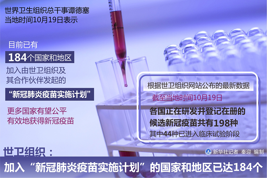 新華社日內瓦10月19日電(記者聶曉陽 陳俊俠)世界衛生組織總干事譚德塞19日表示,目前已有184個國家和地區加入由世衛組織及其合作伙伴發起的“新冠肺炎疫苗實施計劃”,更多國家有望公平有效地獲得新冠疫苗。
