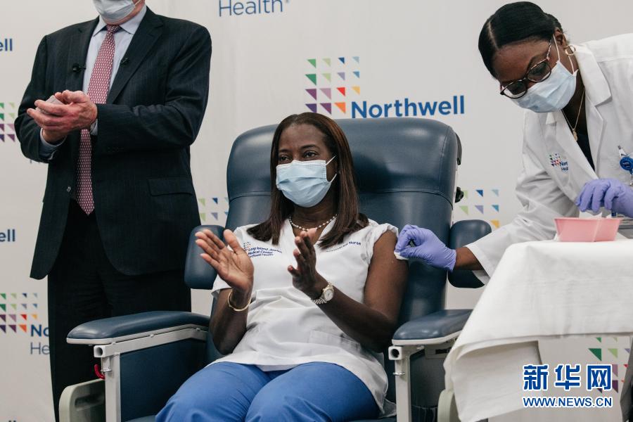 12月14日,在美國(guó)紐約,長(zhǎng)島猶太醫(yī)療中心重癥監(jiān)護(hù)室護(hù)士桑德拉·琳賽(左)接種新冠疫苗。新華社發(fā)(紐約州州長(zhǎng)辦公室供圖)