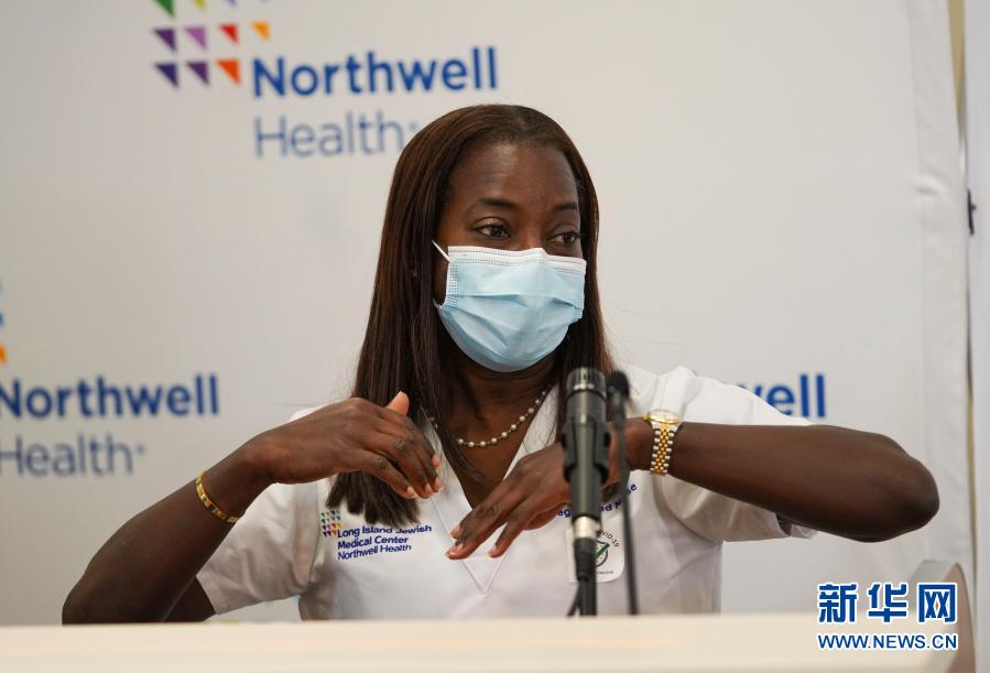 12月14日,在美國(guó)紐約,長(zhǎng)島猶太醫(yī)療中心重癥監(jiān)護(hù)室護(hù)士桑德拉·琳賽接種新冠疫苗后參加新聞發(fā)布會(huì)。新華社記者王迎攝