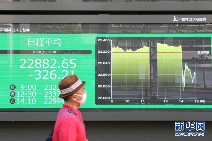 8月28日,日本東京街頭的一處電子股指顯示屏顯示,下午14時左右,受時任日本首相安倍晉三或因健康原因辭職影響,股市指數急速下跌。新華社記者 杜瀟逸 攝