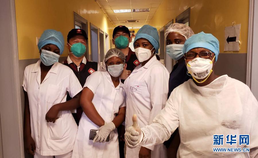 5月26日,中國抗疫醫療專家組在剛果(布)首都布拉柴維爾指導新冠肺炎病房建設時,與當地一線醫務人員合影。新華社發