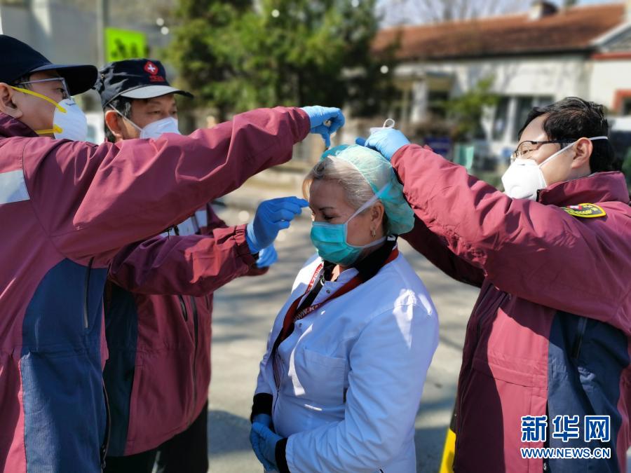 4月4日,中國赴塞爾維亞抗疫醫療專家組在貝爾格萊德的基層發熱門診走訪時,幫助塞爾維亞醫生特里富諾維奇(中)佩戴高標準的防護口罩。新華社發