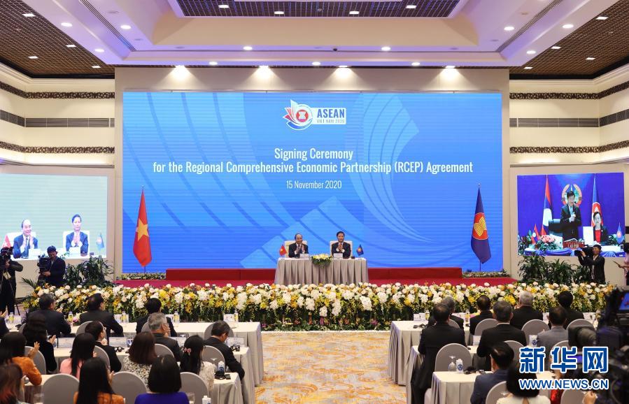這是11月15日在越南首都河內拍攝的區域全面經濟伙伴關系協定(RCEP)簽署儀式現場。新華社/越通社