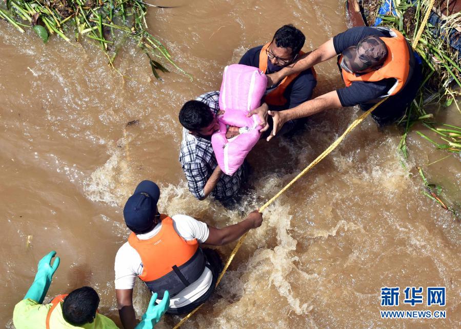 10月18日,救援人員從印度海得拉巴一處被洪水圍困的房屋中救出一名嬰兒。新華社發