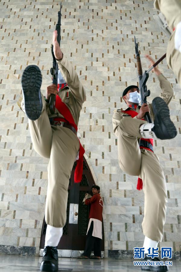 3月23日,巴基斯坦軍人在位于卡拉奇的國父真納墓參加“巴基斯坦日”紀念活動。