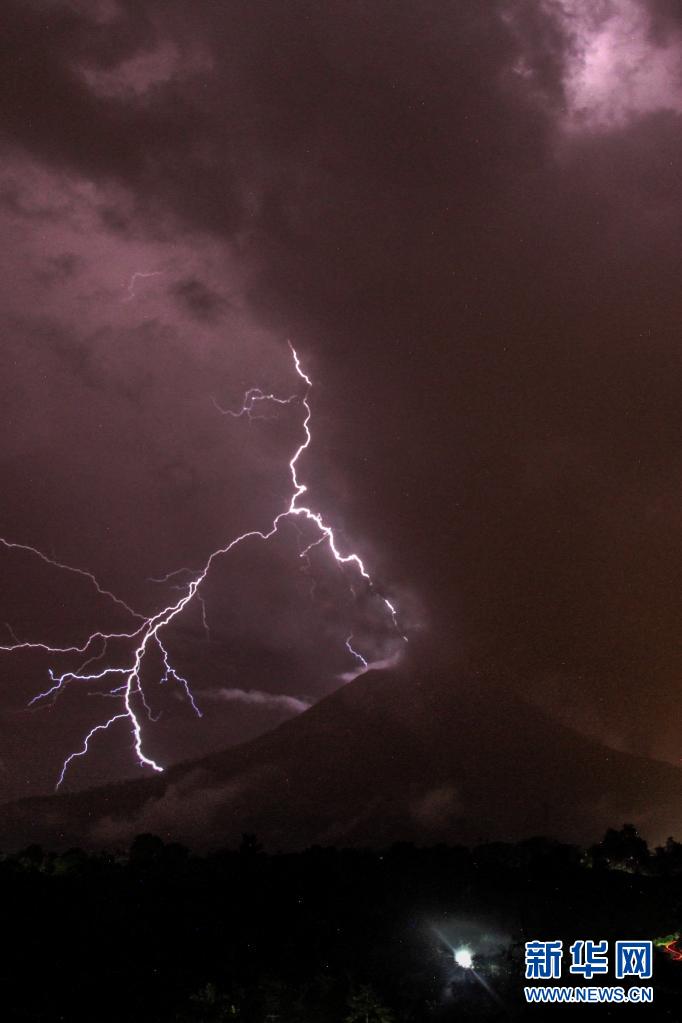 這是5月13日在印度尼西亞北蘇門答臘省拍攝的錫納朋火山上空的閃電(長時間曝光照片)。