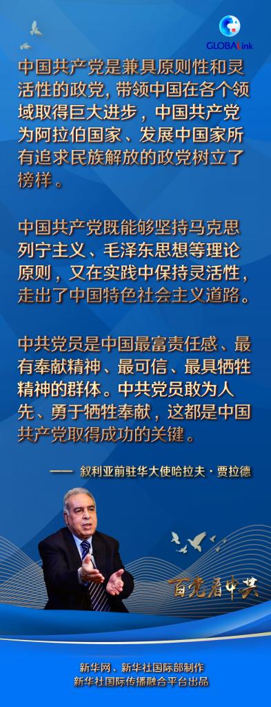 新華社大馬士革6月3日電(記者汪健 鄭一晗)敘利亞前駐華大使哈拉夫·賈拉德日前在大馬士革接受新華社記者專訪時說,中國共產(chǎn)黨是兼具原則性和靈活性的政黨,帶領(lǐng)中國在各個領(lǐng)域取得巨大進步,“中國共產(chǎn)黨為阿拉伯國家、發(fā)展中國家所有追求民族解放的政黨樹立了榜樣”。